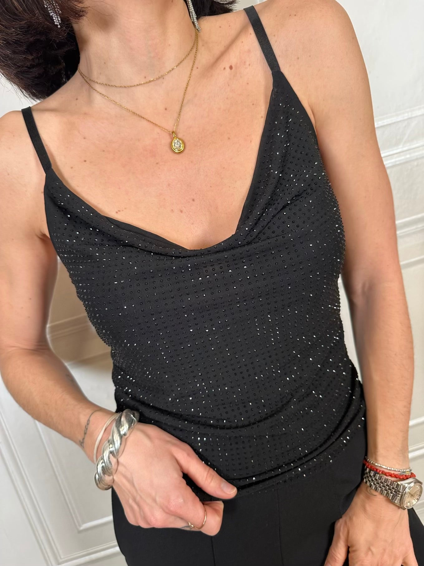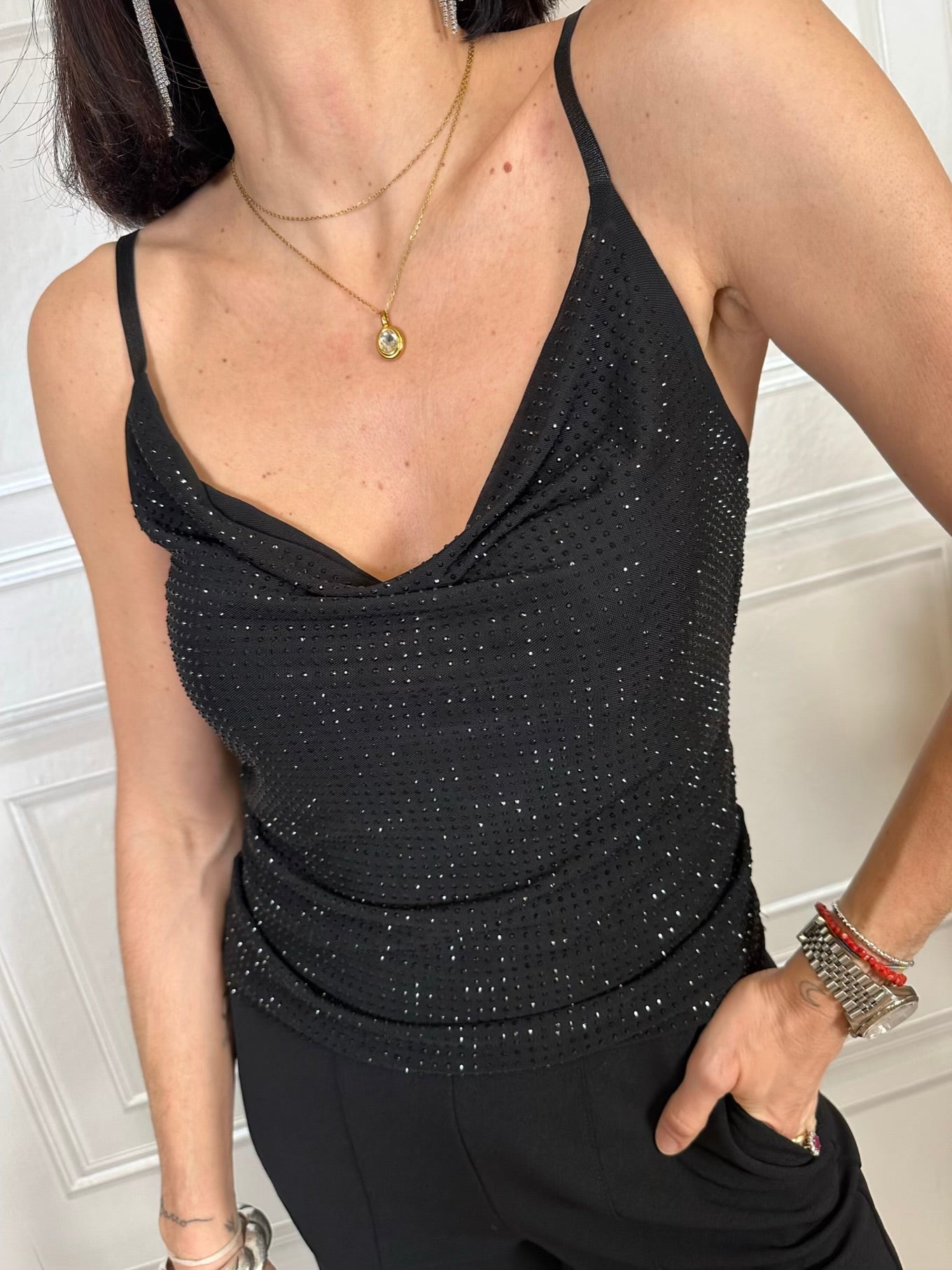 Top in tessuto tempestato di strass tono su tono. Modello con scollo a cascata e spalline sottili regolabili.