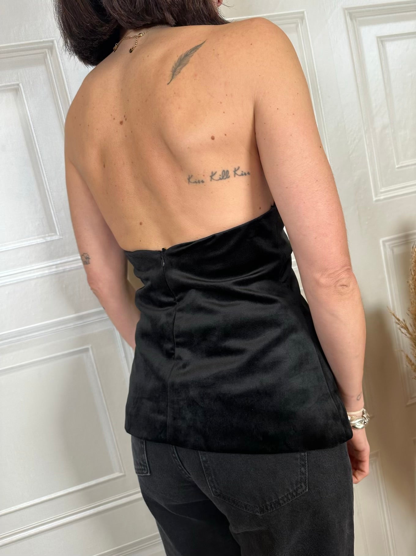 Alto con scollo a V e fiocco sul davanti. Modello senza spalline con chiusura posteriore con cerniera. In foto taglia S, vestibilità regolare. Lunghezza da spalla: 38cm circa