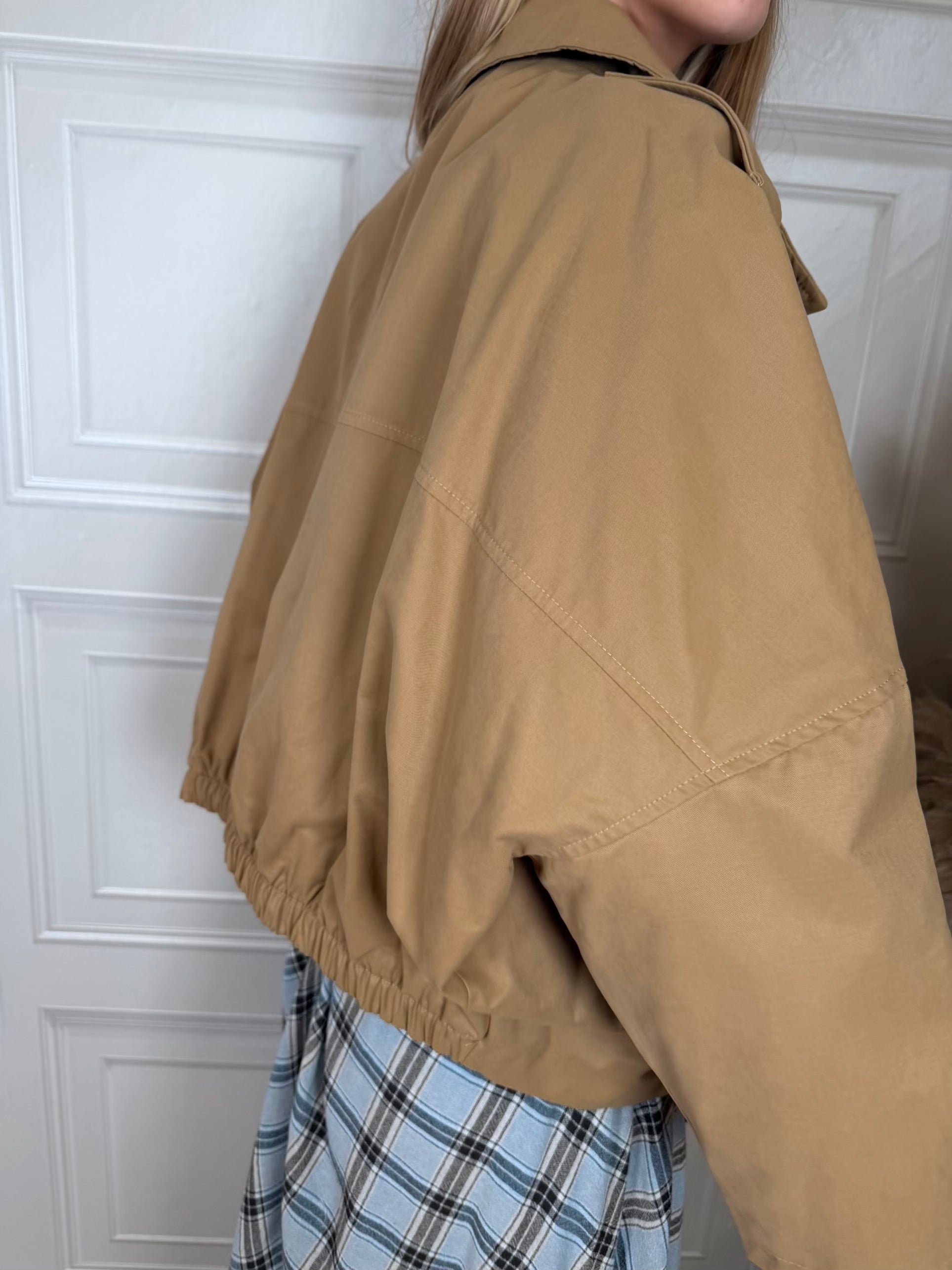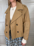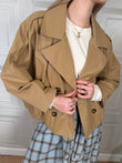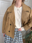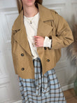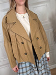Trench corto beige. Modello doppiopetto con elastico sul retro. Tasche sul davanti