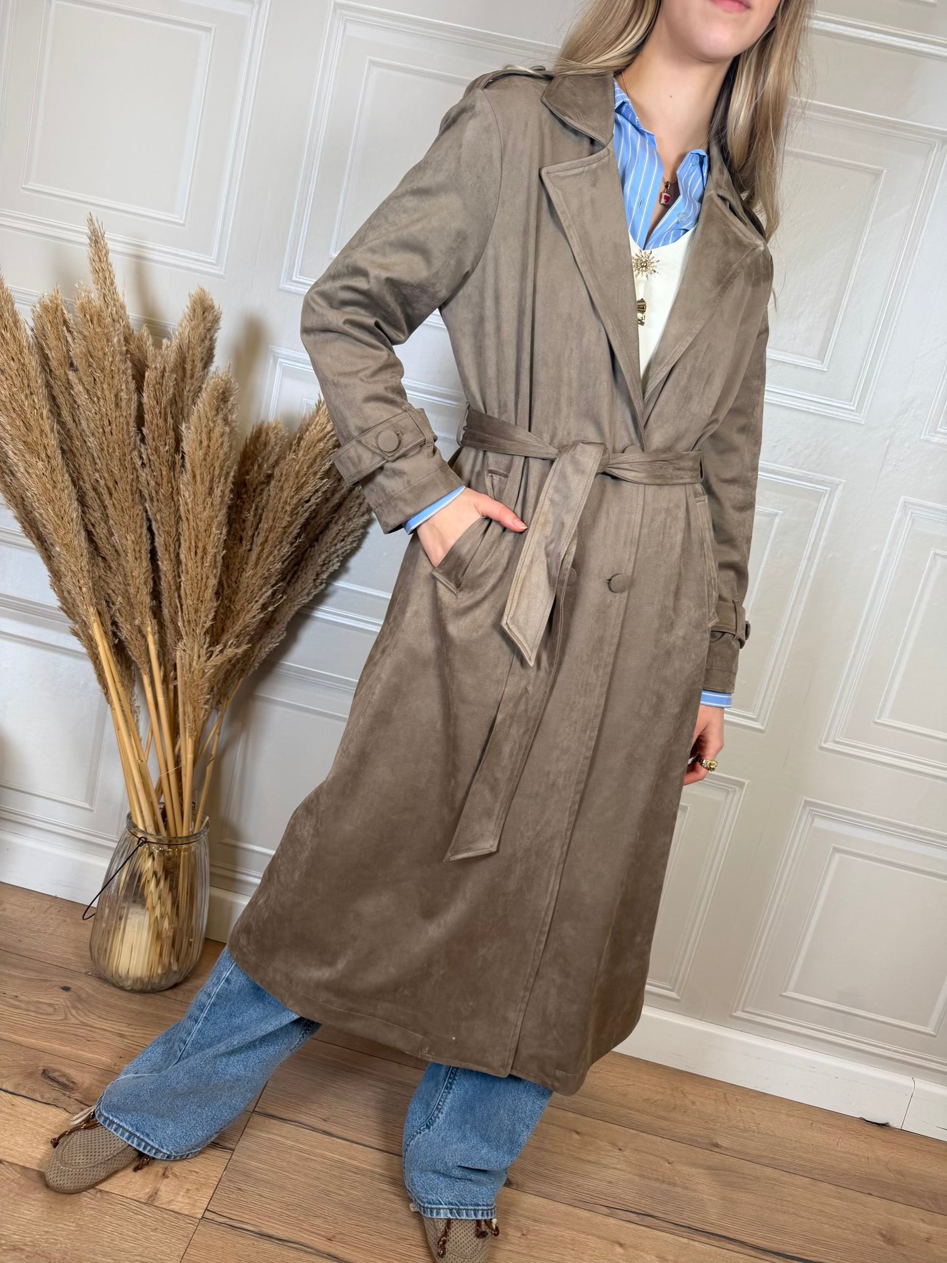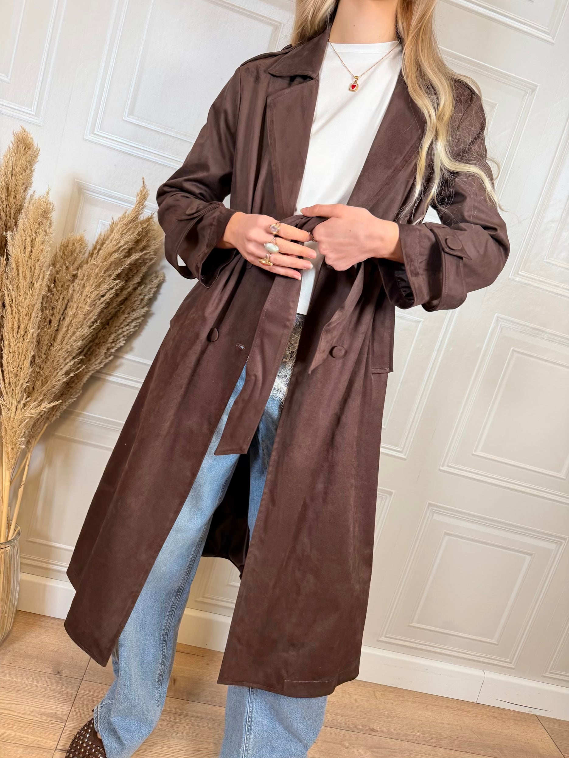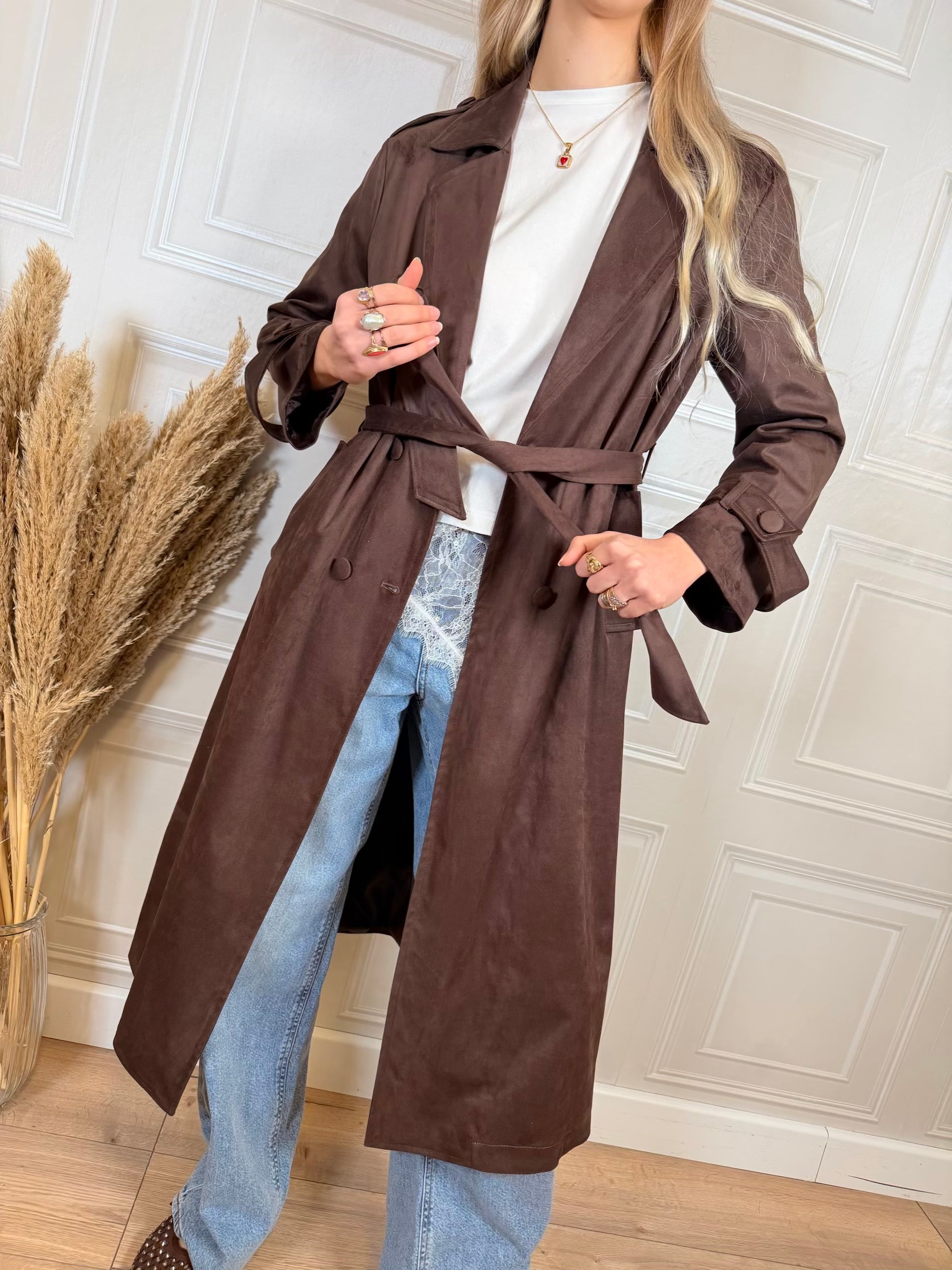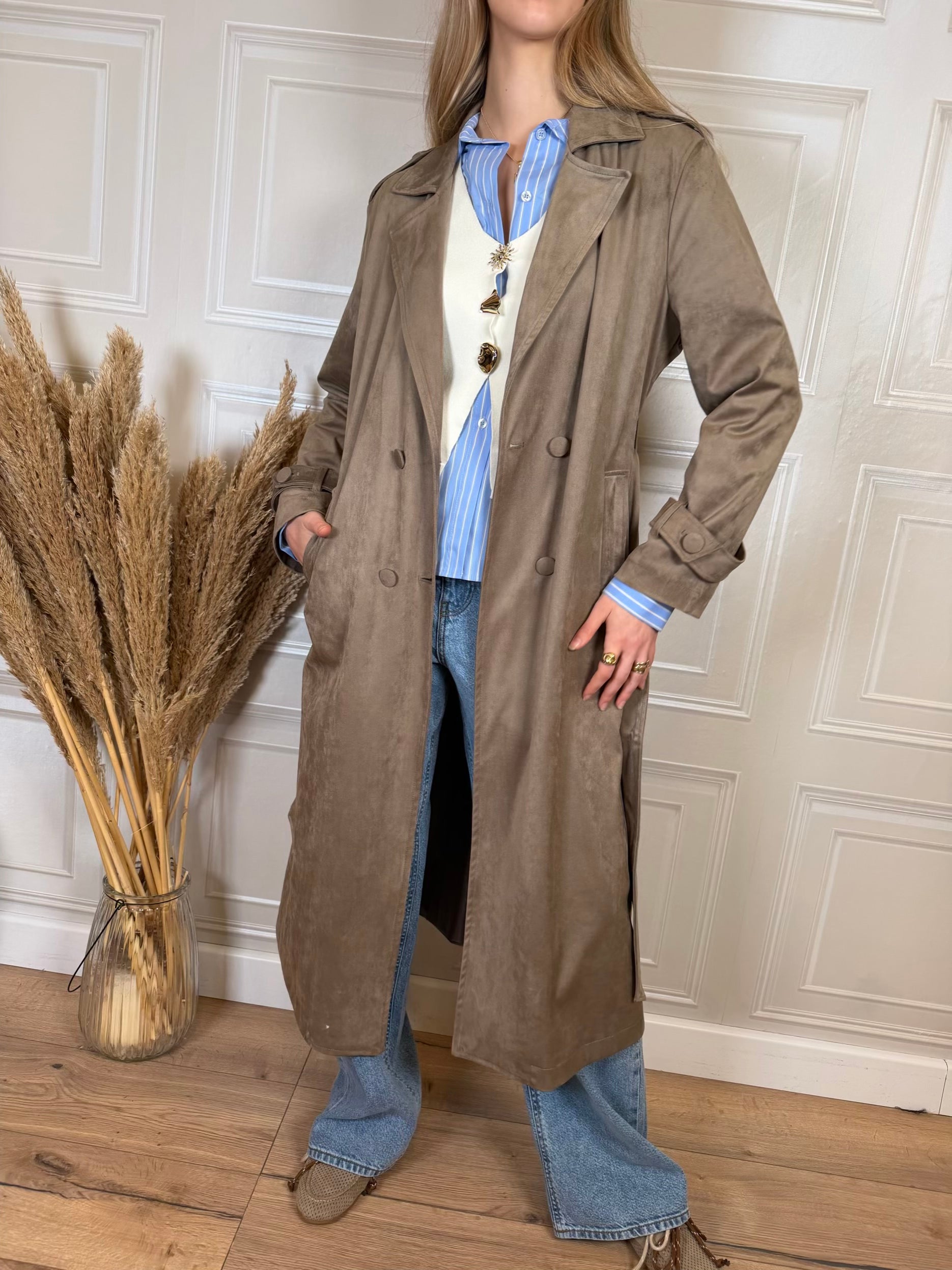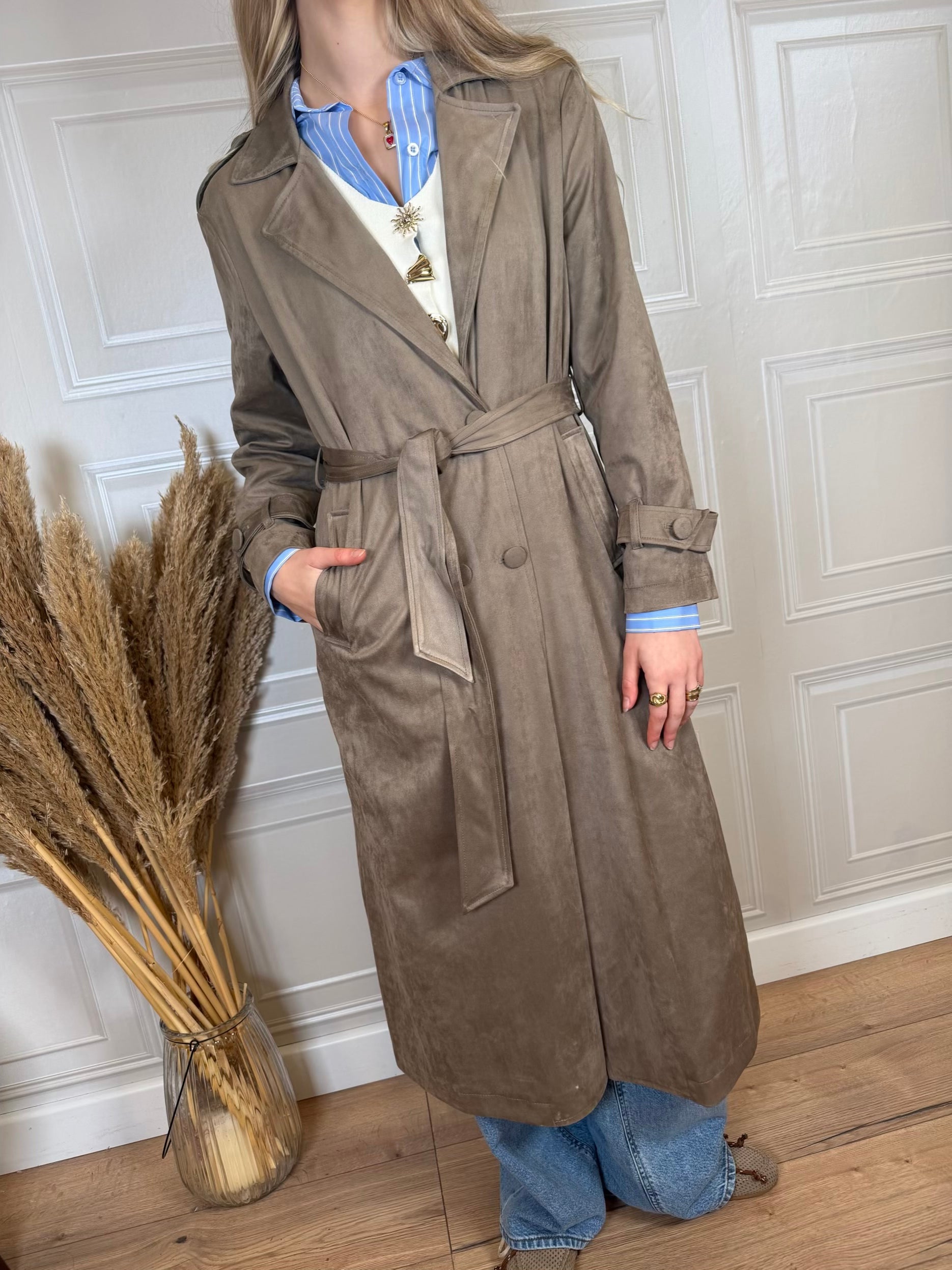 Trench lungo in suede. Modello doppiopetto con tasche laterali e cintura in vita. Dettagli di cinturini su spalle e polsi. Foderanti internamente. In foto taglia XS. Vestibilità morbida.