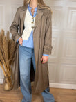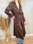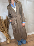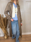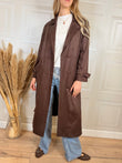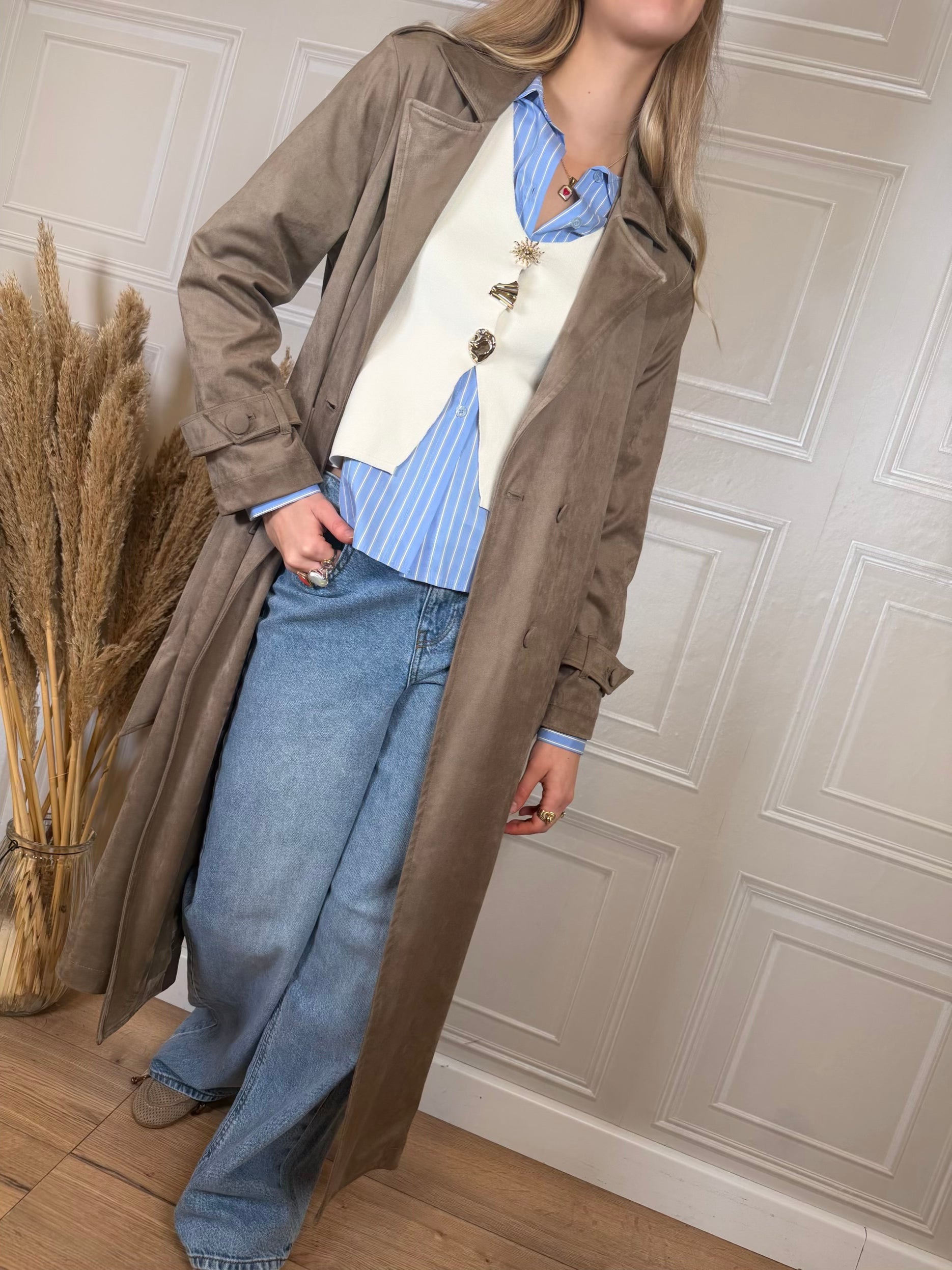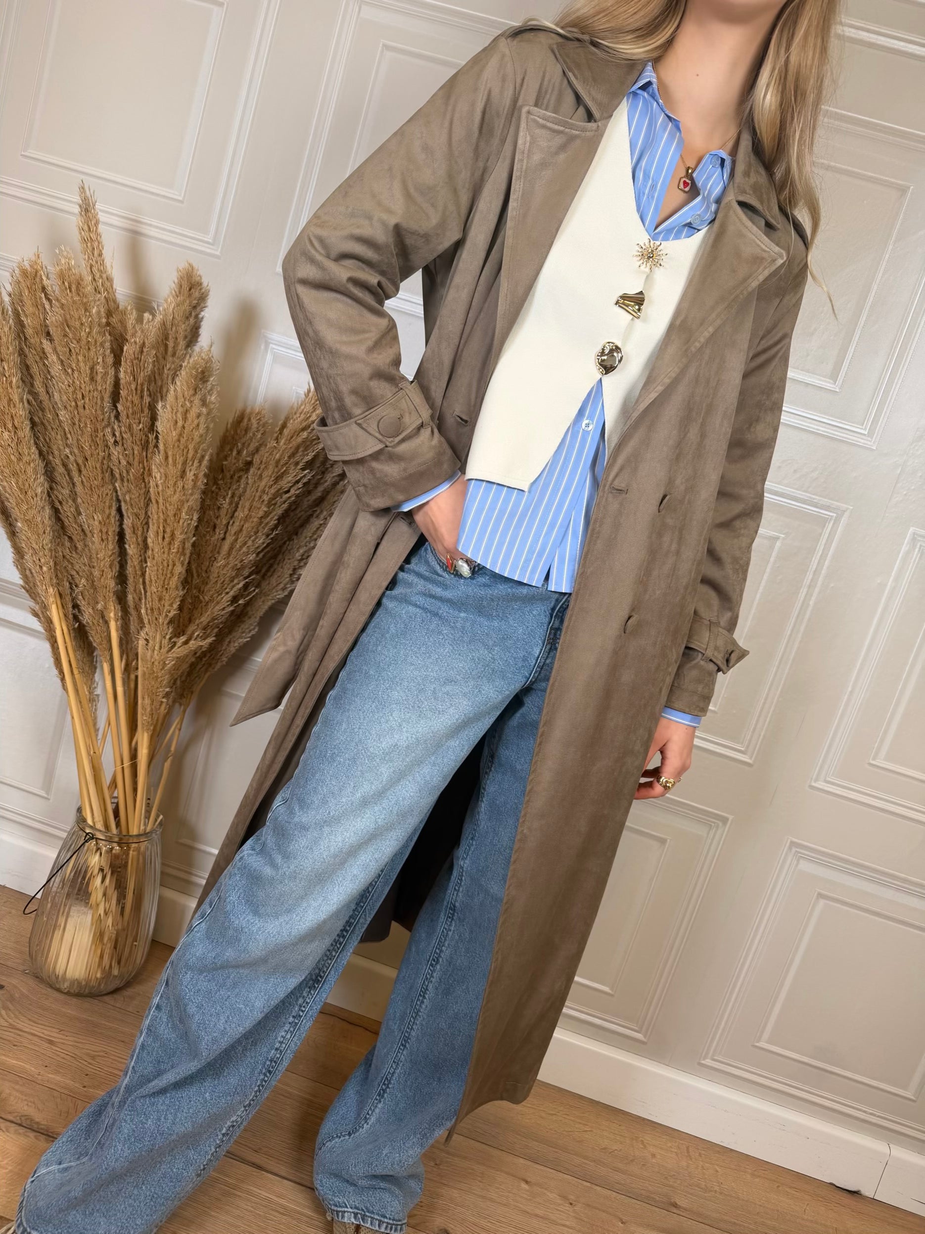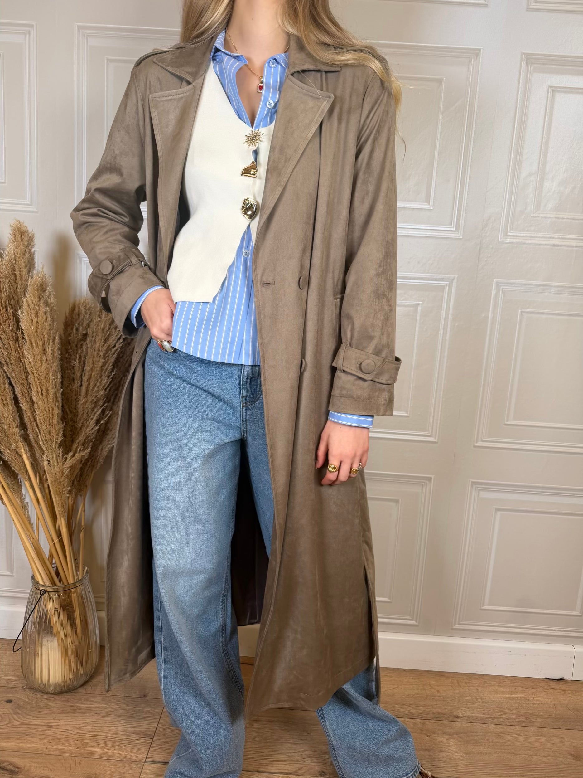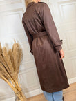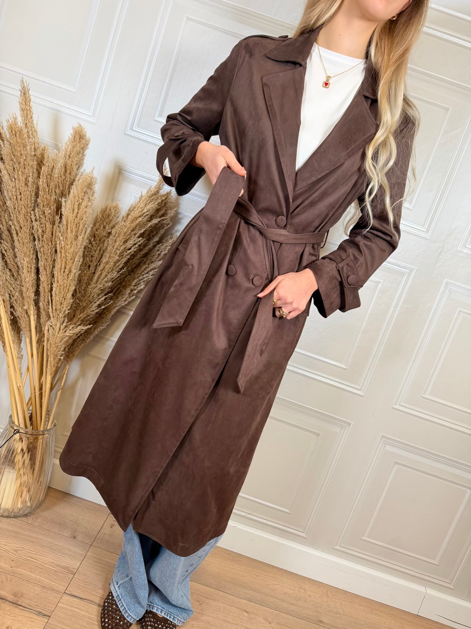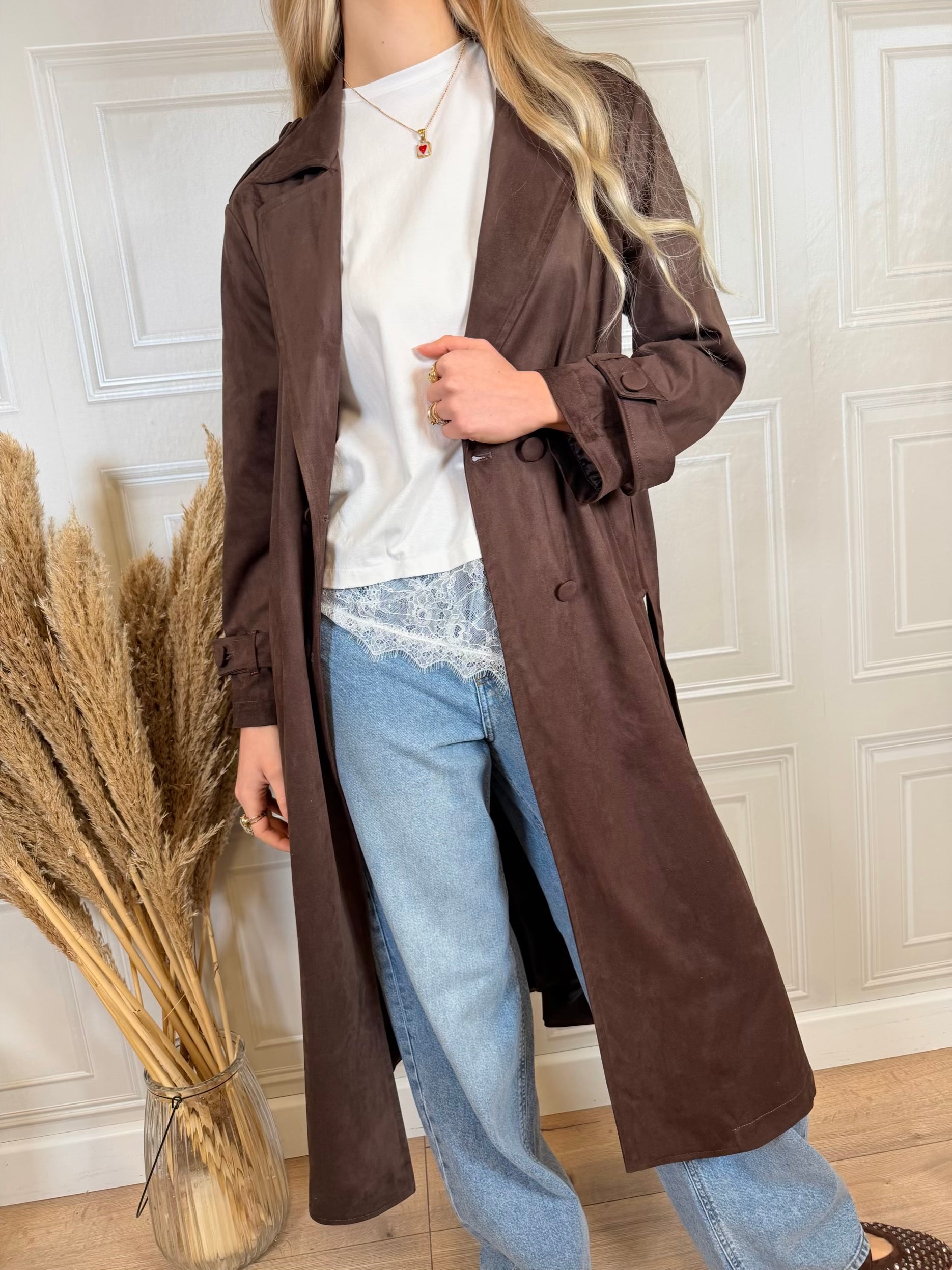 Trench lungo in suede. Modello doppiopetto con tasche laterali e cintura in vita. Dettagli di cinturini su spalle e polsi. Foderanti internamente. In foto taglia XS. Vestibilità morbida.