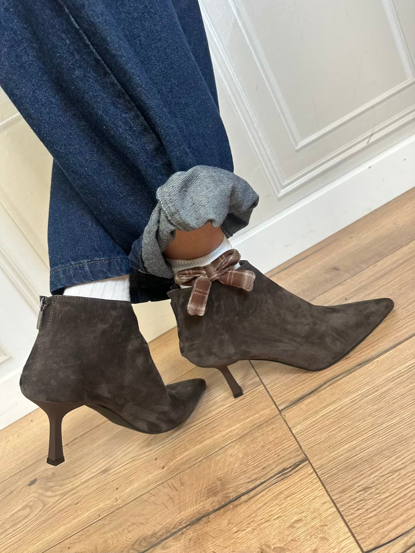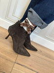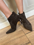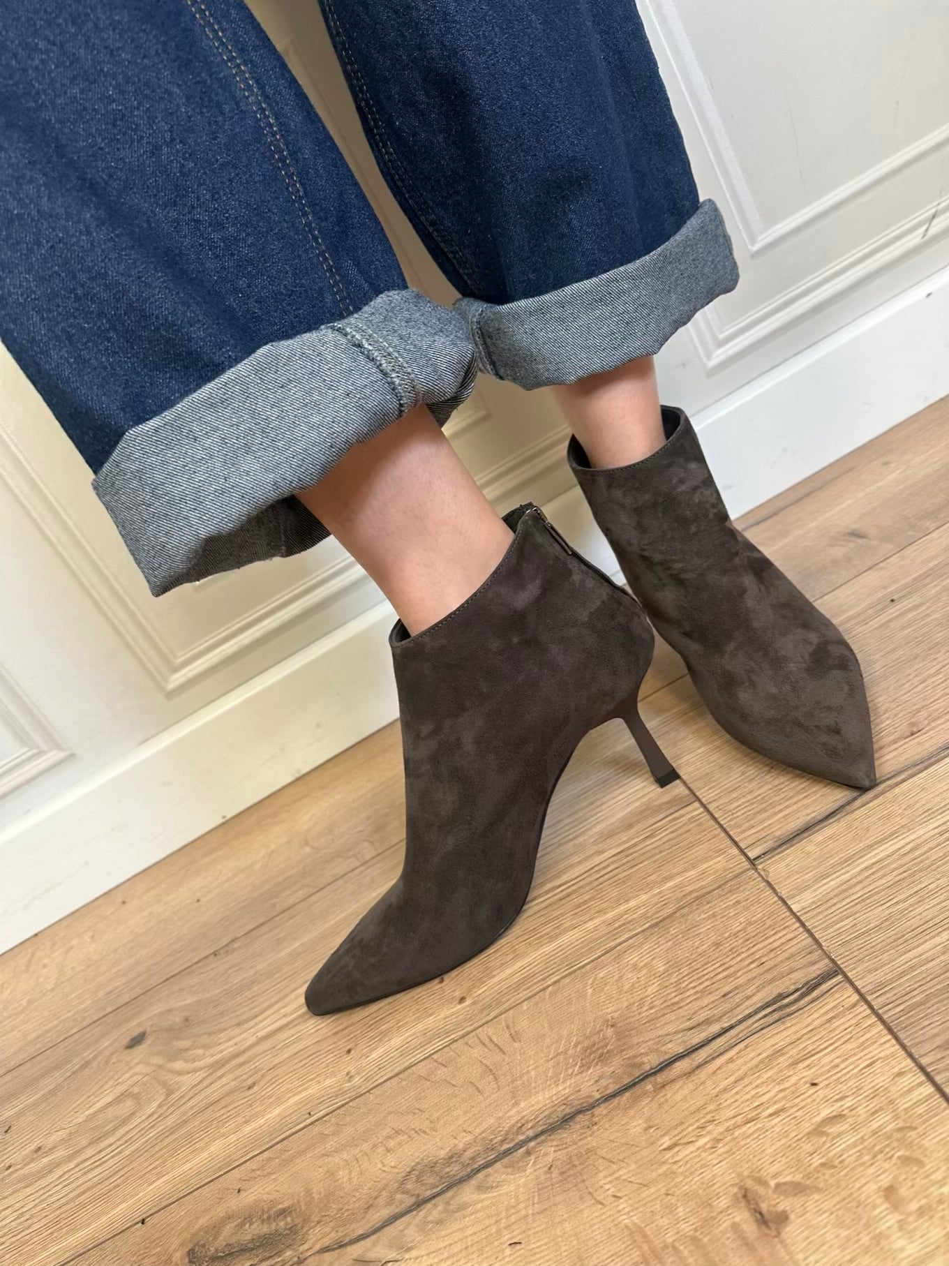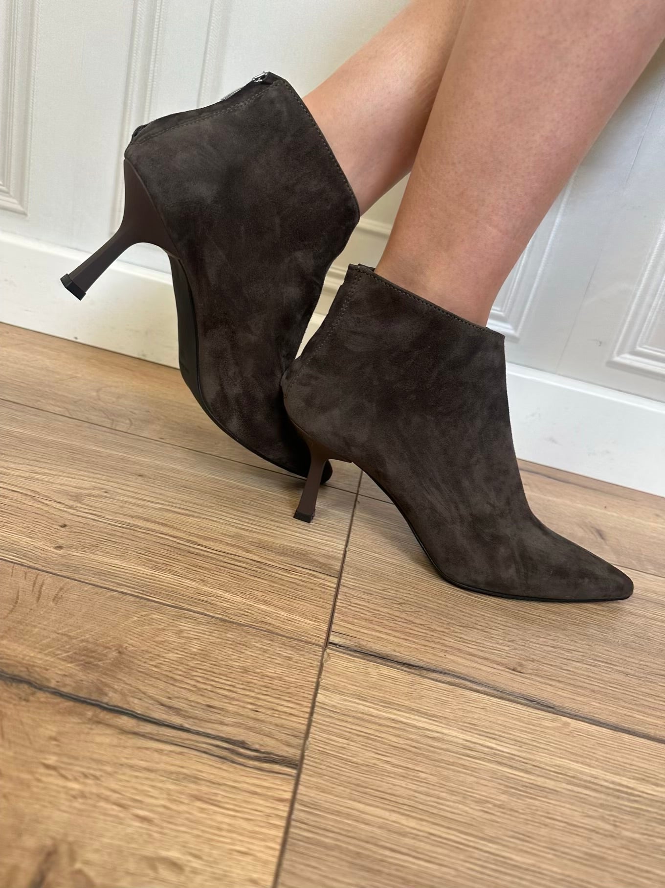Stivaletto a tronchetto in camoscio moro. Modello a punta.
