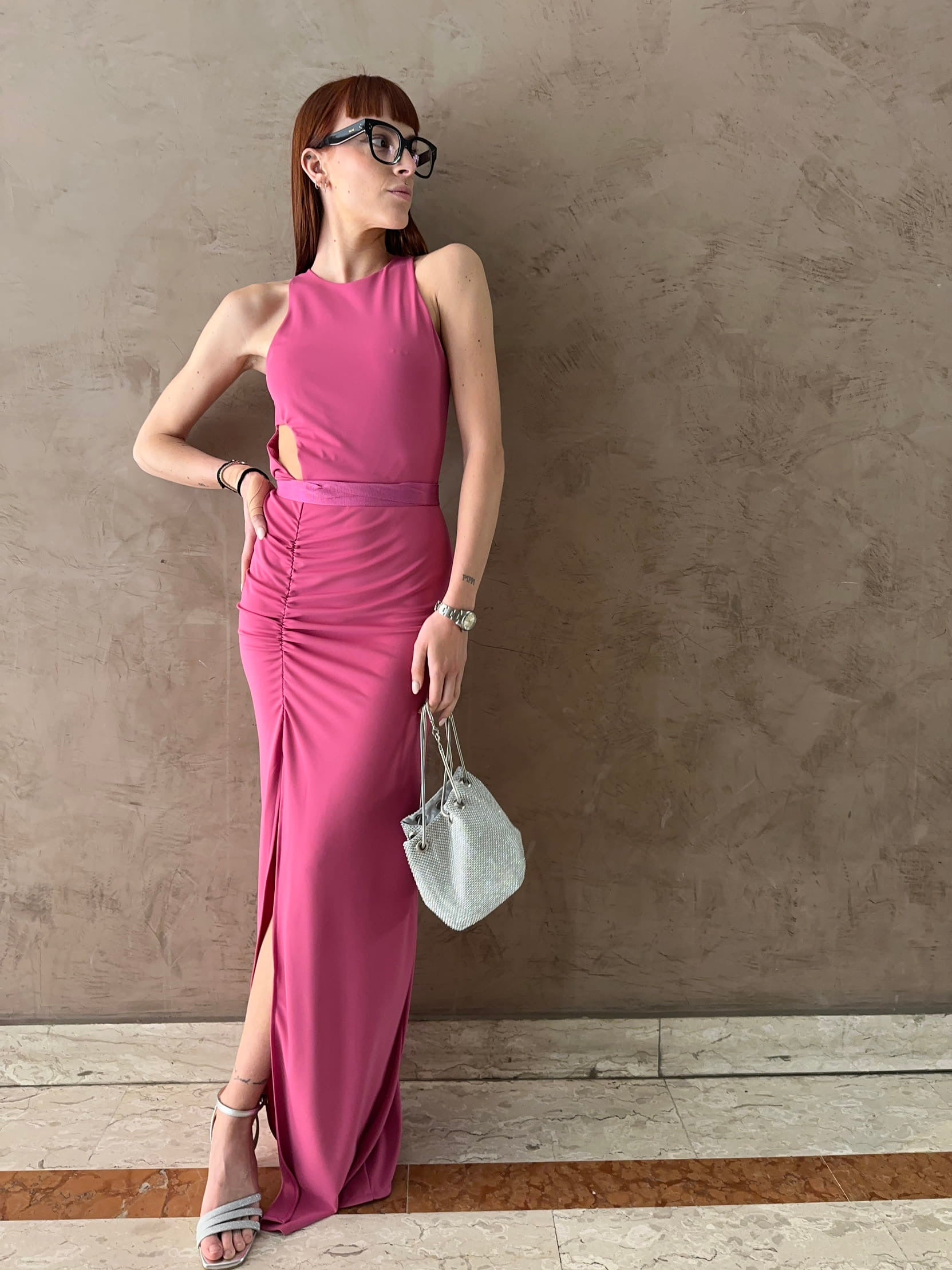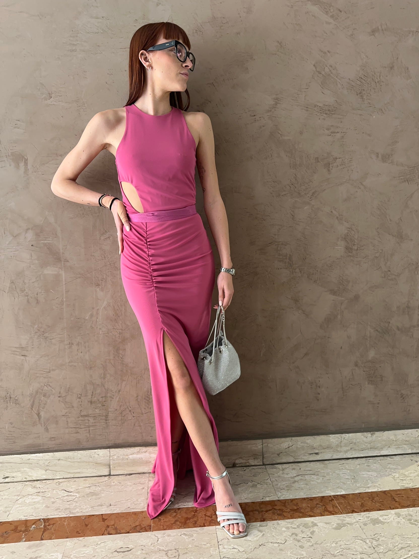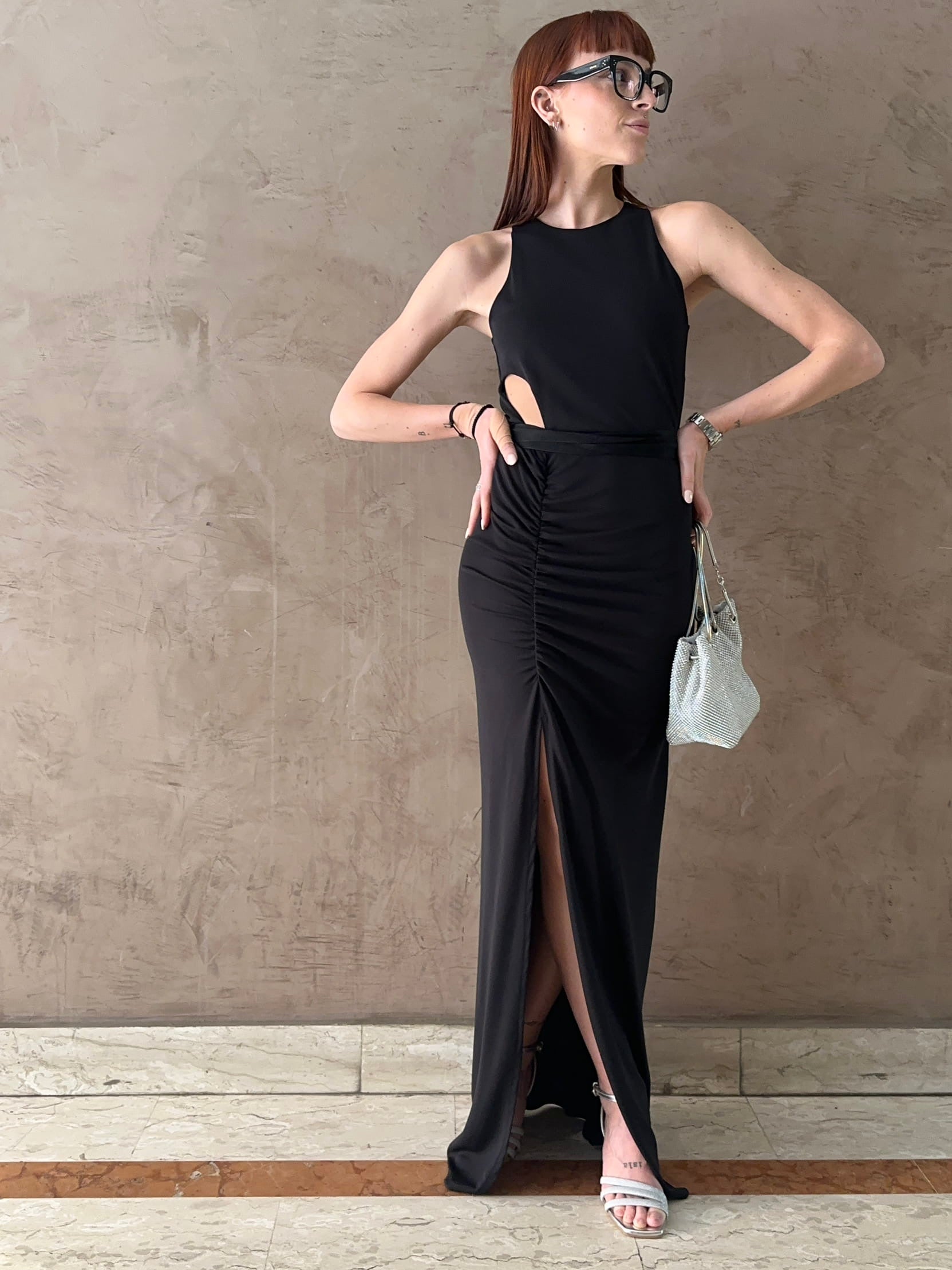 Vestito con cut out. Modello girocollo, con spacco laterale e fusciacca tono su tono. In foto taglia S. Vestibilità regolare.