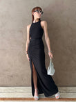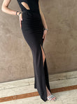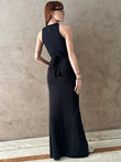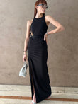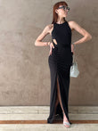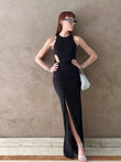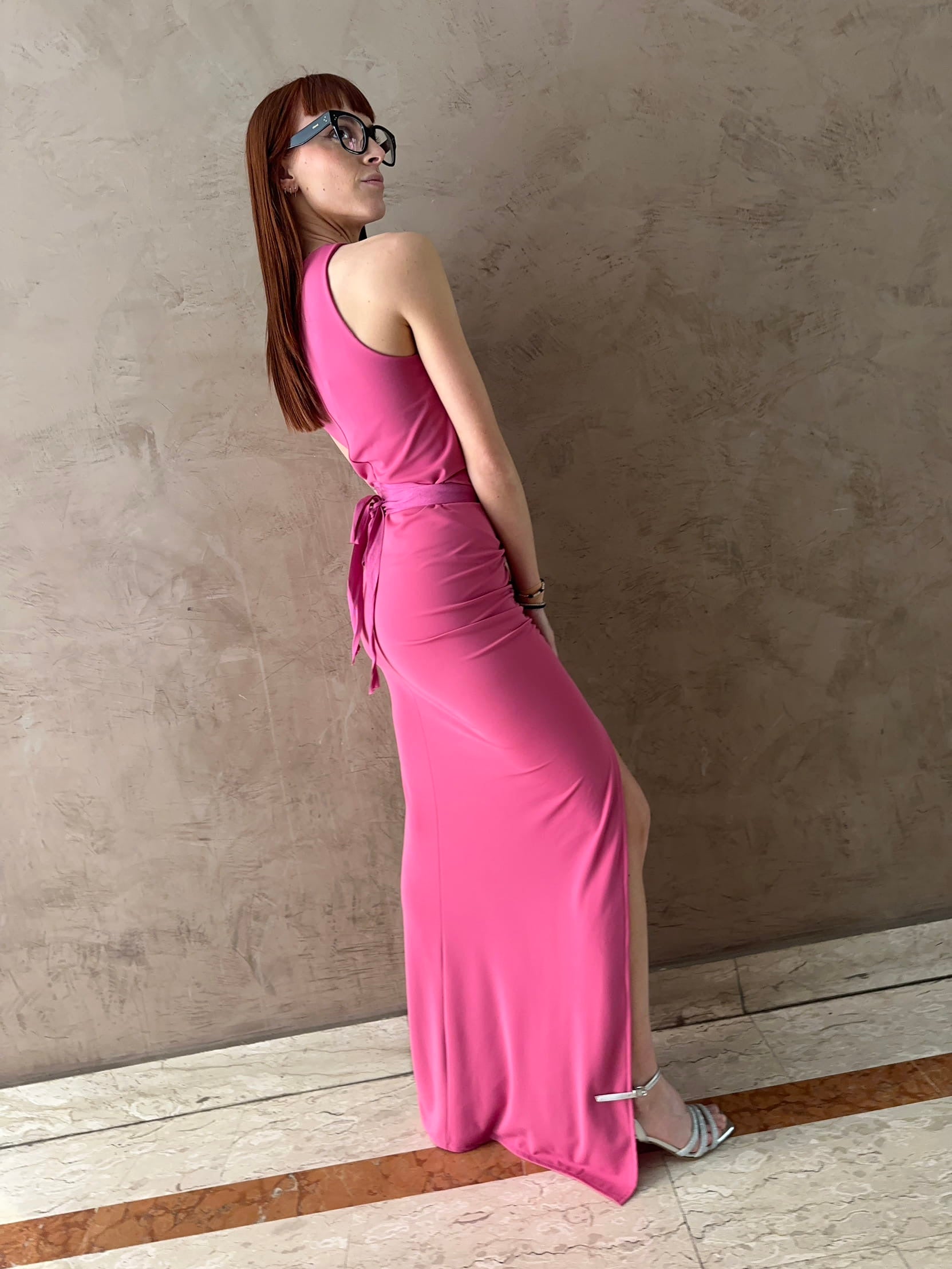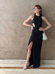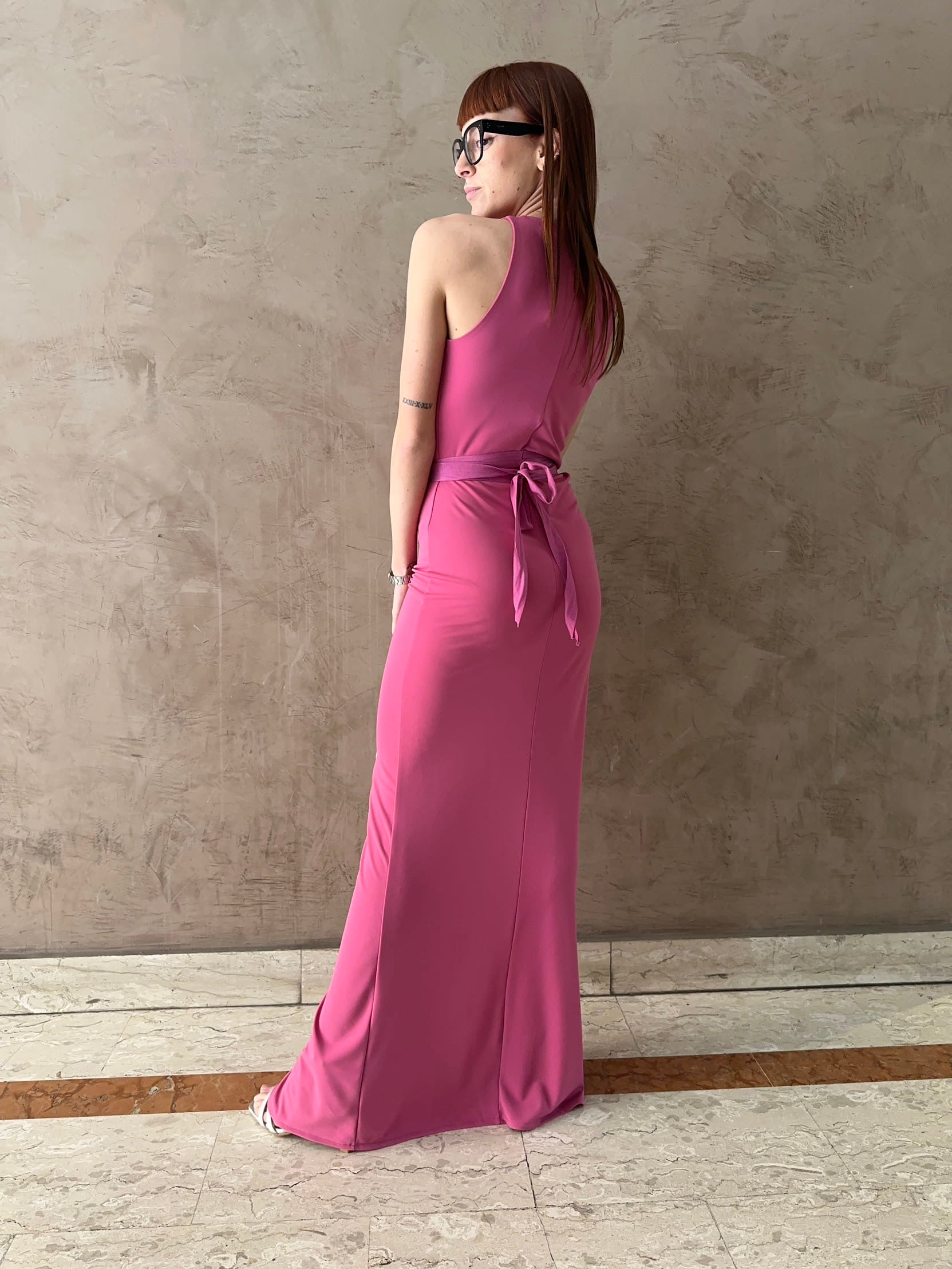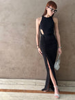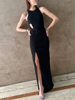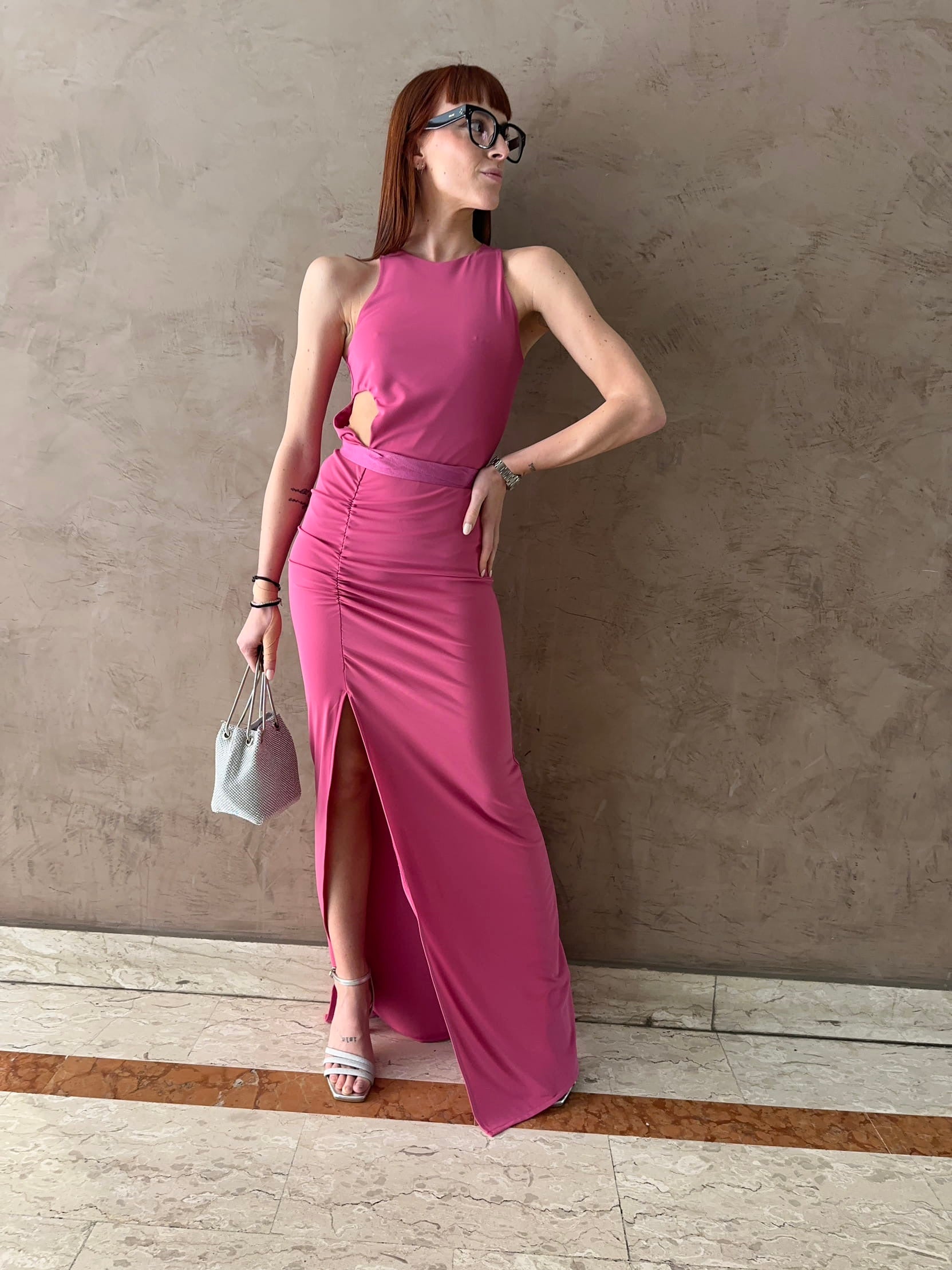 Vestito con cut out. Modello girocollo, con spacco laterale e fusciacca tono su tono. In foto taglia S. Vestibilità regolare.