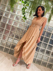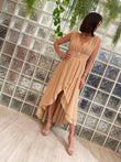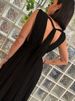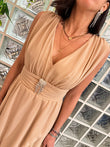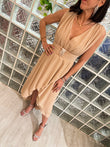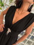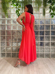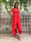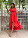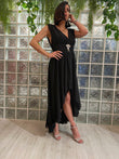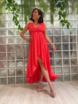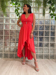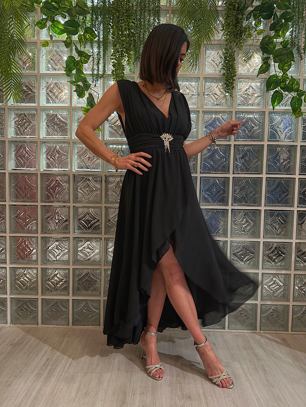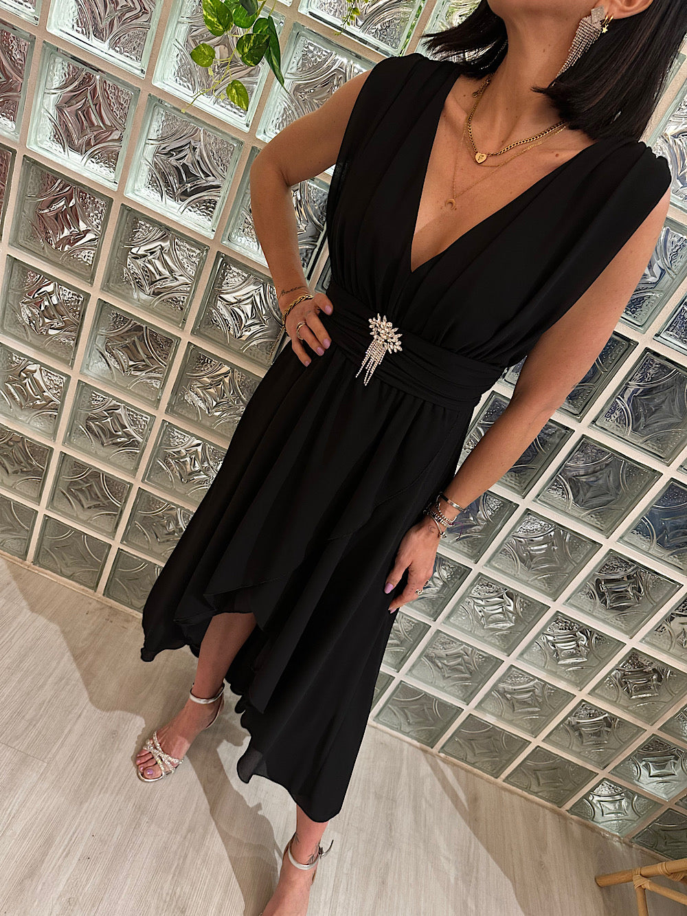 Modello scollato a V, dettaglio chiusura sul collo con fiocco e gonna a portafoglio.