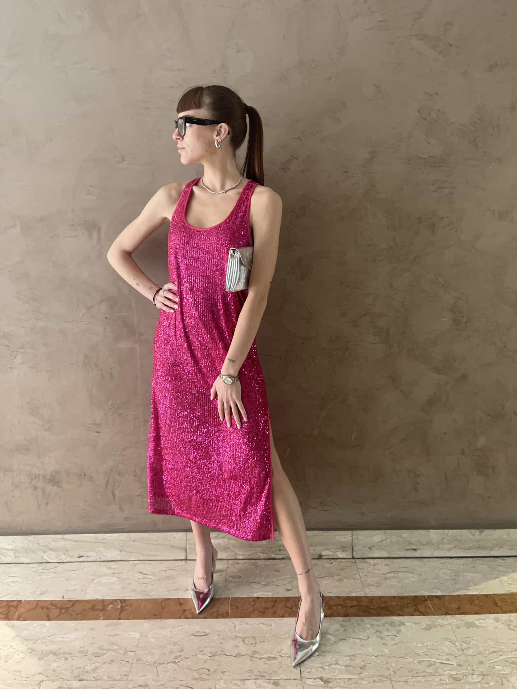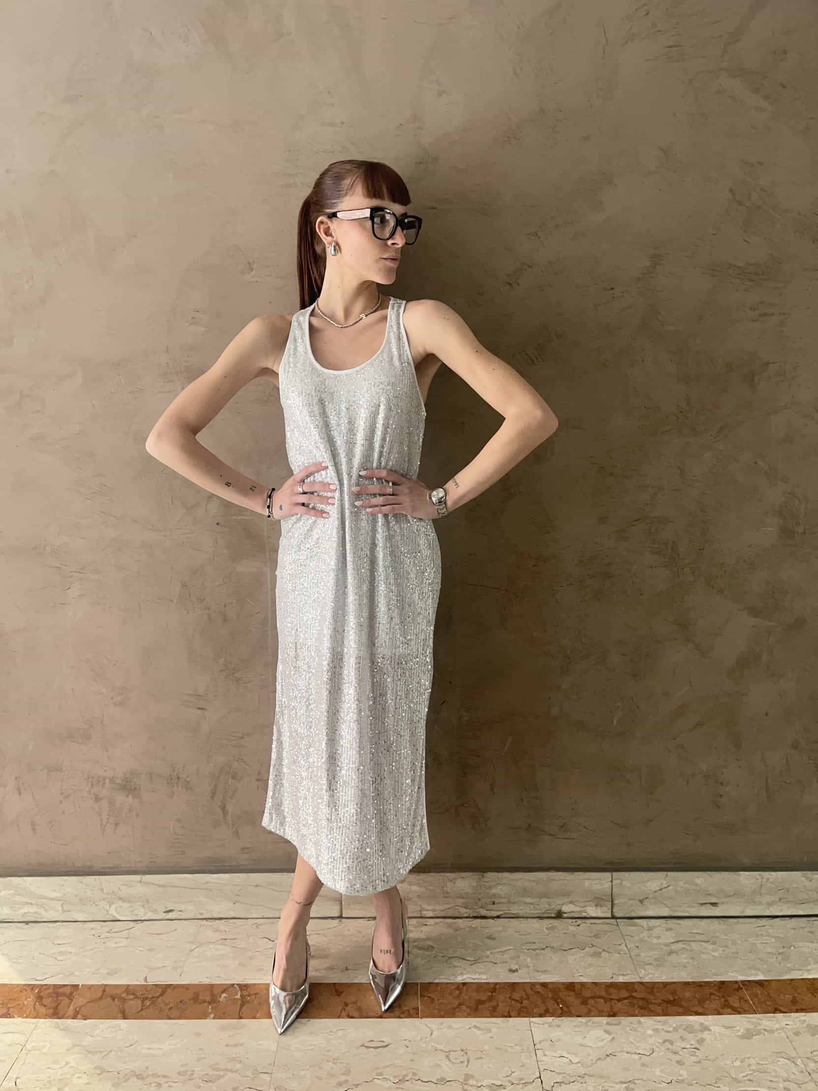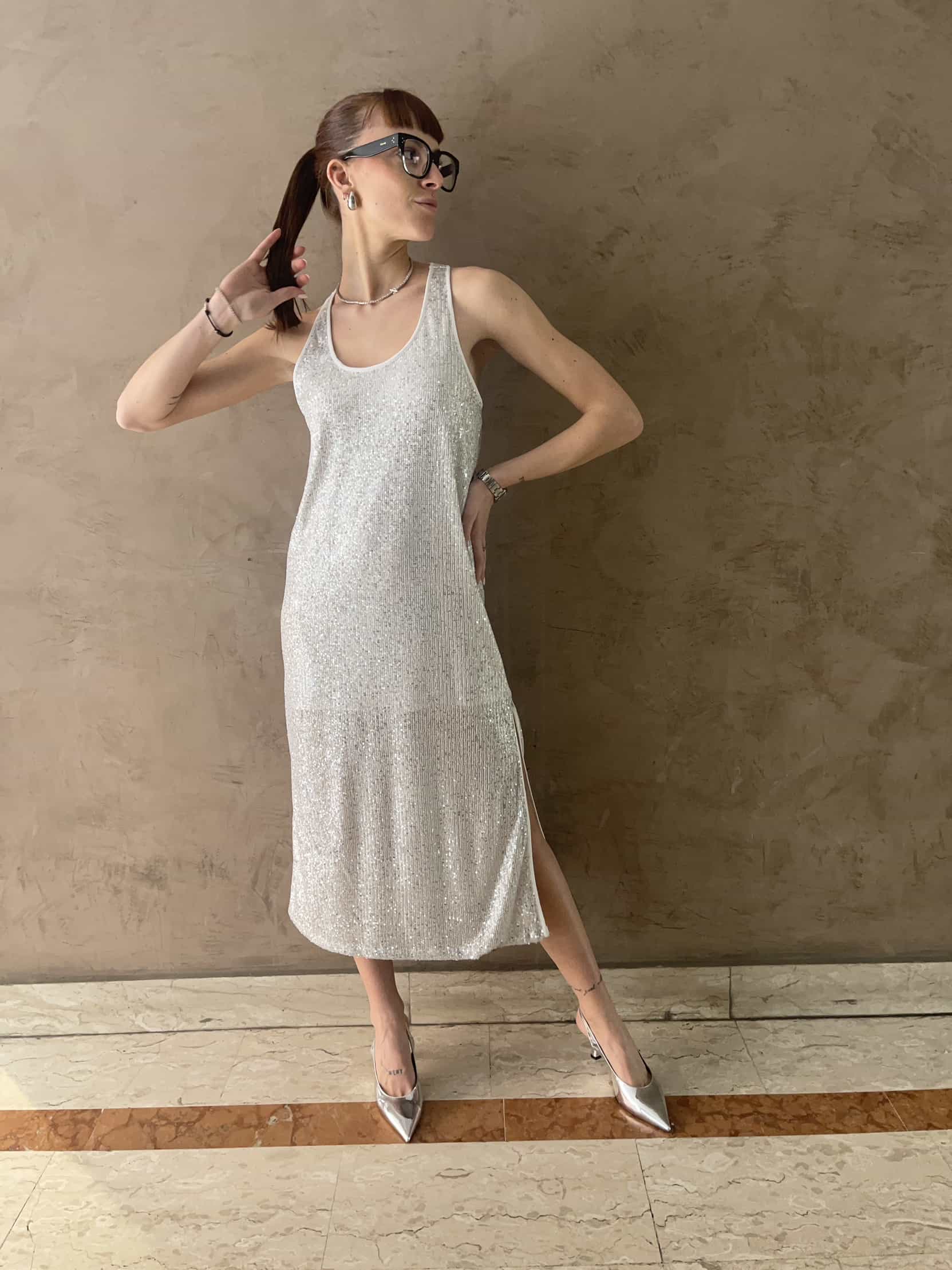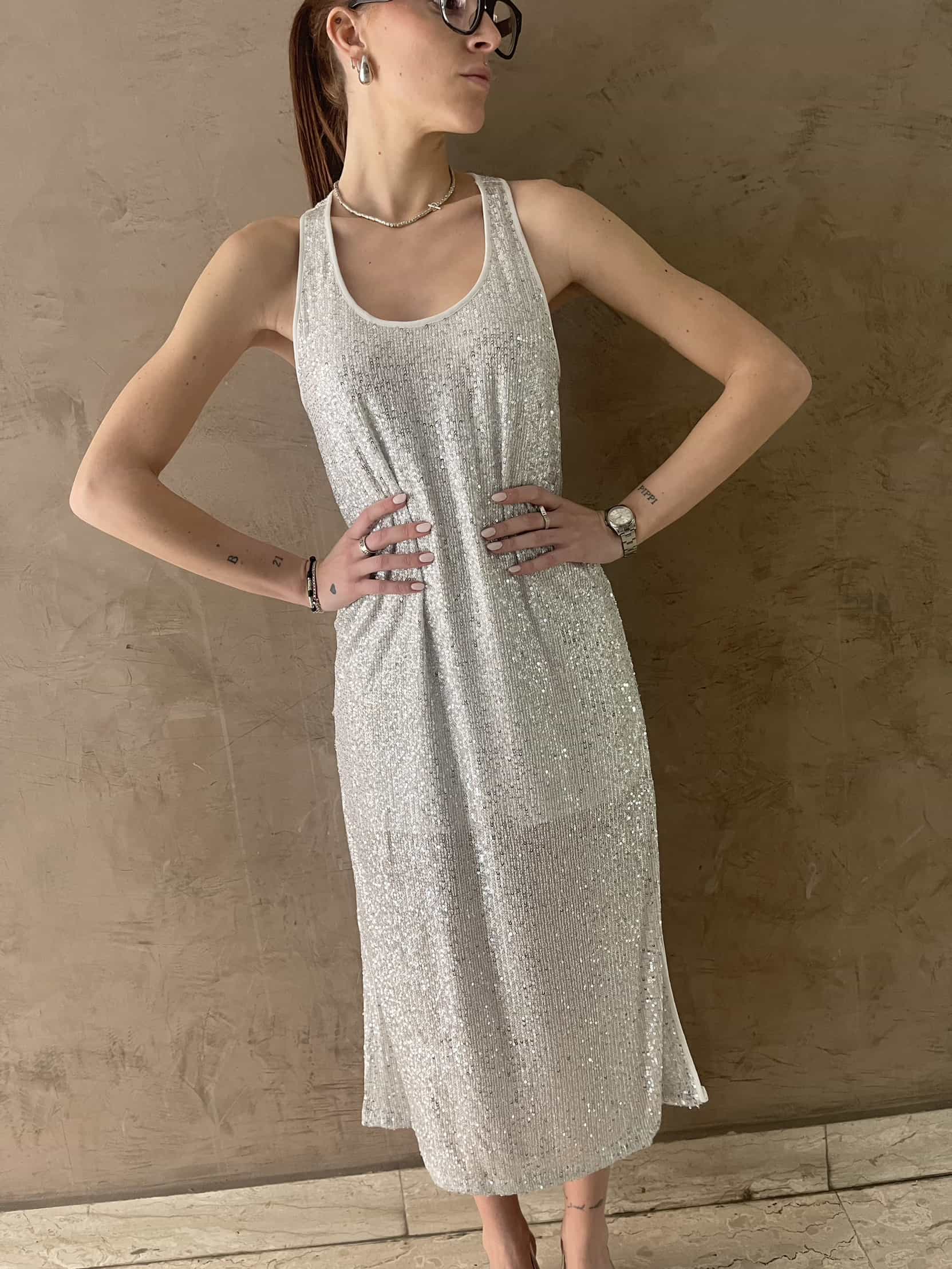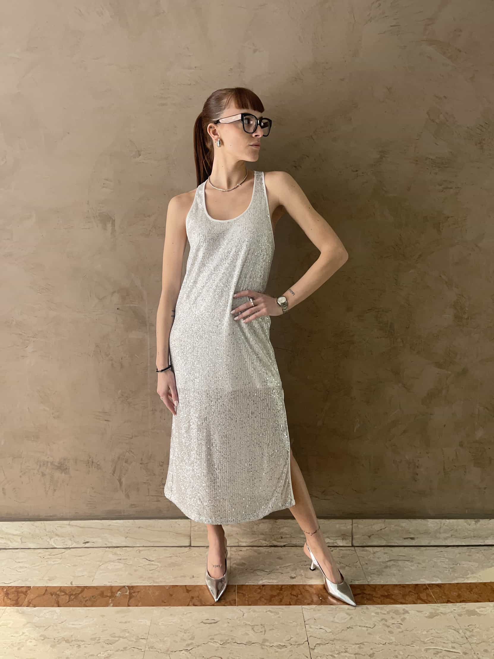 Vestito in paillettes. Modello con scollo all’americana. Spacco laterale.
