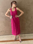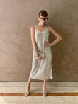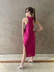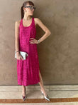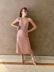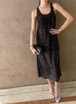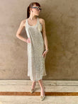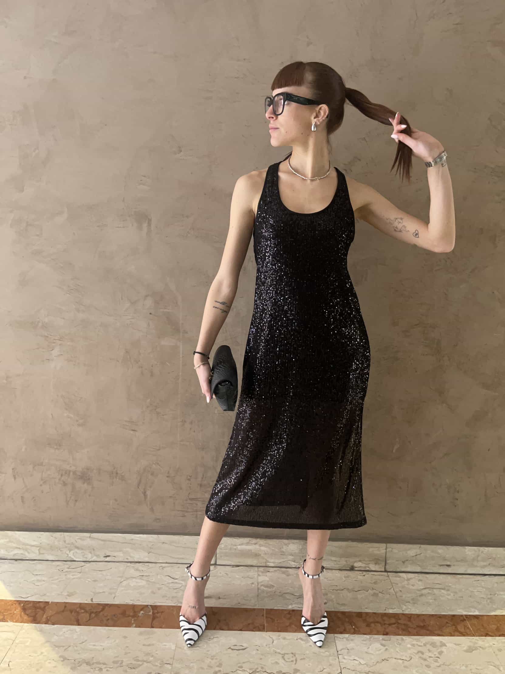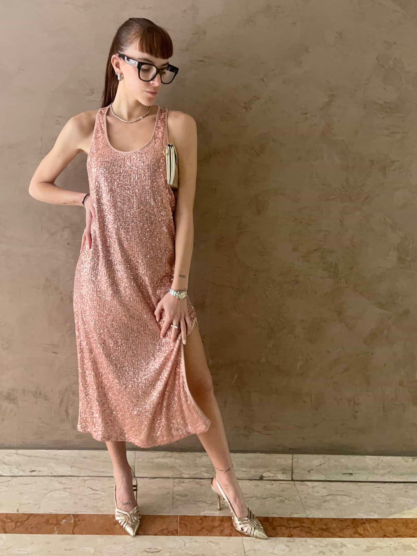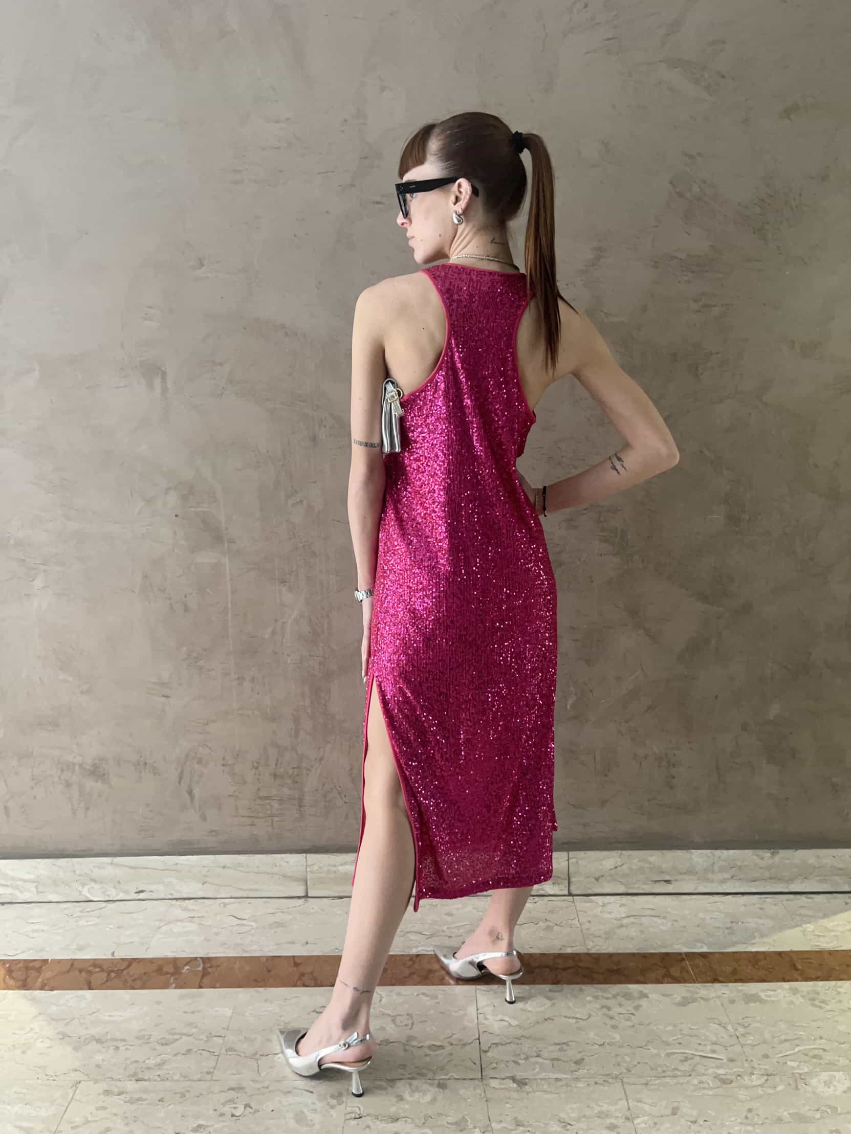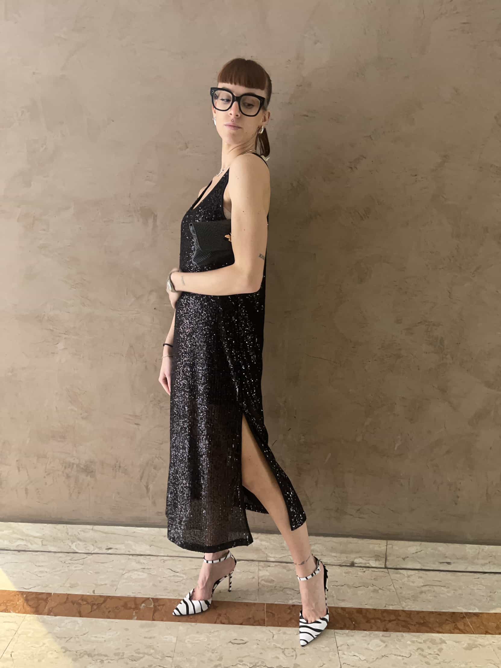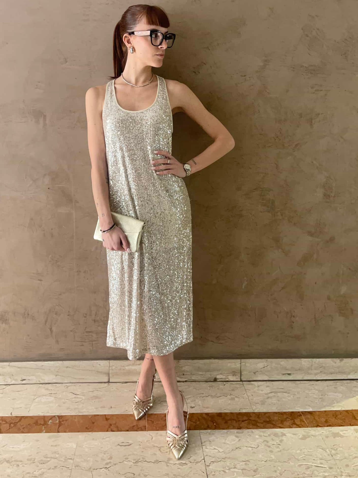 Vestito in paillettes. Modello con scollo all’americana. Spacco laterale.